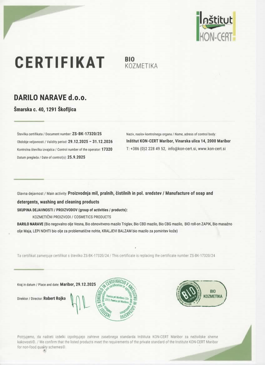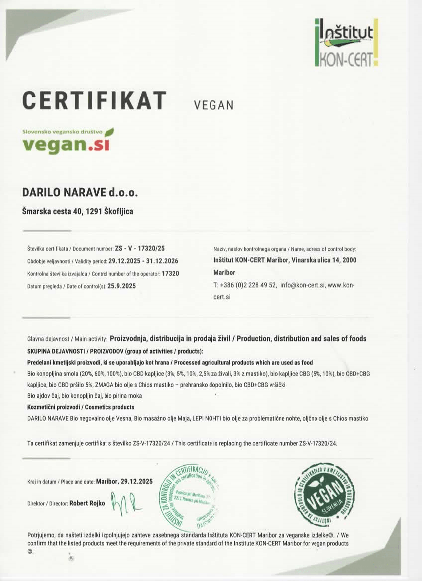 Tukaj so naši trenutni certifikati, ki potrjujejo naše zaveze k trajnostnosti in kakovosti. Naša predanost naravi, zdravju in etični praksi je osrednji del naše identitete. Če imate vprašanja glede Darila Narave in naših certifikatov, smo vam z veseljem na voljo za pojasnila in dodatne informacije.