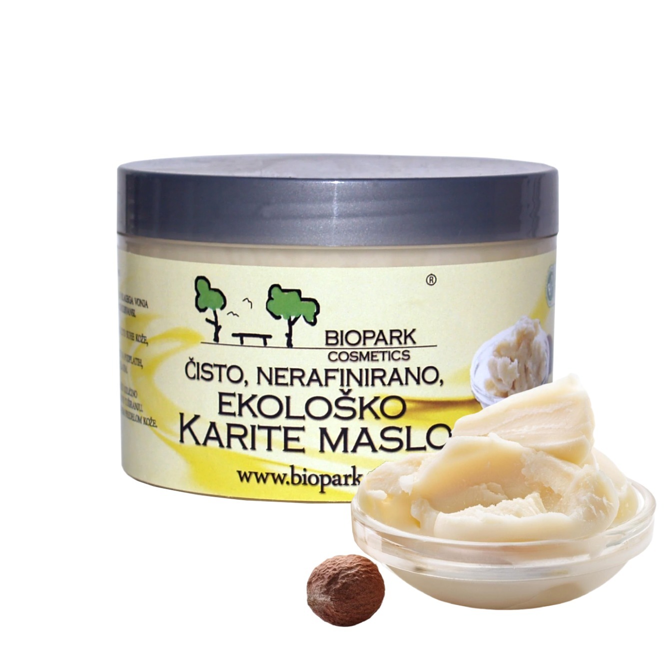 Ekološko nerafinirano karite maslo znamke Biopark Cosmetics je pripravljeno iz skrbno izbranih ekoloških karitejevih oreščkov, da ohrani vse naravne negovalne učinkovine za suho in razdraženo kožo. Maslo izjemno prijetne strukture, naravne bež barve in blagega vonja po oreških, se ob stiku s kožo zaradi telesne toplote zmehča in odlično vpija. Na koži ustvari zaščitni sloj, ki pomaga ohranjati vlago ter povrniti mehkobo in elastičnost tudi zelo suhi, hrapavi ali razpokani koži. Koža je po uporabi mehka, nahranjena in vidno bolj negovana.